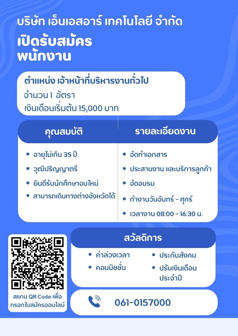 เงินเดือนเริ่มต้น 15,000 บาท/เดือน